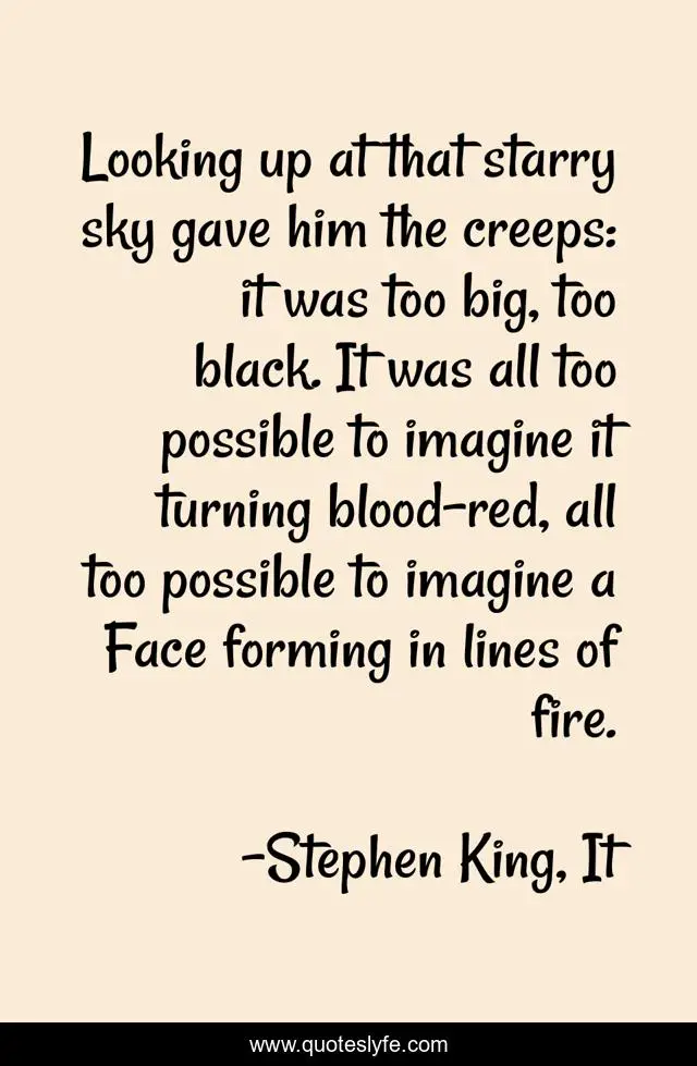 This page presents the quote "Looking up at that starry sky gave him the creeps: it was too big, too black. It was all too possible to imagine it turning blood-red, all too possible to imagine a Face forming in lines of fire.". Author of this quote is Stephen King, It. This quote is about fire, big, sky, face, black, stars, red,.
