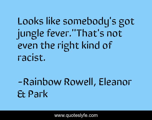 This page presents the quote "Looks like somebody's got jungle fever.''That's not even the right kind of racist.". Author of this quote is Rainbow Rowell, Eleanor & Park. .
