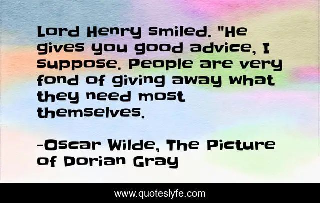 This page presents the quote "Lord Henry smiled. "He gives you good advice, I suppose. People are very fond of giving away what they need most themselves.". Author of this quote is Oscar Wilde, The Picture of Dorian Gray. .