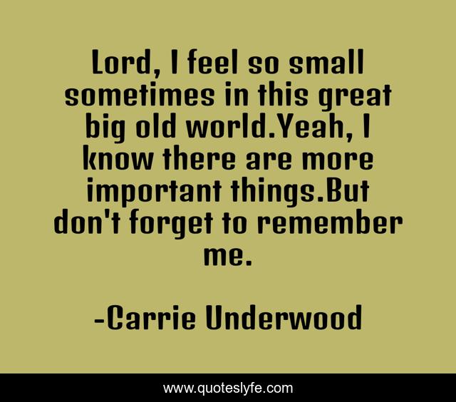 This page presents the quote "Lord, I feel so small sometimes in this great big old world.Yeah, I know there are more important things.But don't forget to remember me.". Author of this quote is Carrie Underwood. This quote is about country, carrie-underwood, music,.