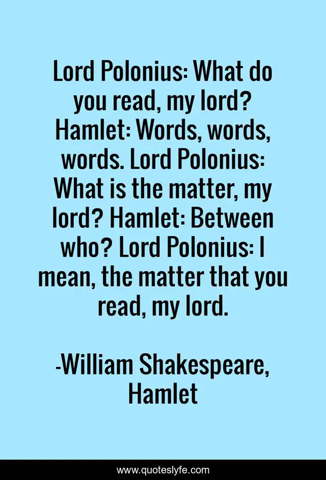 Lord Polonius: What do you read, my lord? Hamlet: Words, words, words. Lord Polonius: What is the matter, my lord? Hamlet: Between who? Lord Polonius: I mean, the matter that you read, my lord.