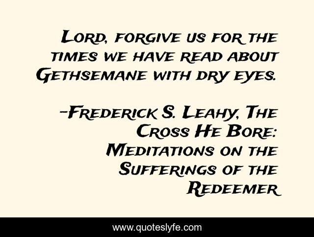 This page presents the quote "Lord, forgive us for the times we have read about Gethsemane with dry eyes.". Author of this quote is Frederick S. Leahy, The Cross He Bore: Meditations on the Sufferings of the Redeemer. This quote is about jesus, christ, theology,.