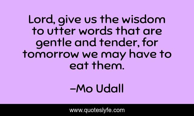 This page presents the quote "Lord, give us the wisdom to utter words that are gentle and tender, for tomorrow we may have to eat them.". Author of this quote is Mo Udall. This quote is about may, tomorrow, words,.