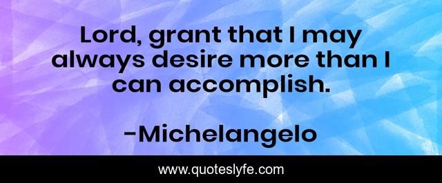 This page presents the quote "Lord, grant that I may always desire more than I can accomplish.". Author of this quote is Michelangelo. This quote is about desire, accomplish, i can,.