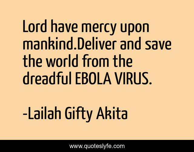 This page presents the quote "Lord have mercy upon mankind.Deliver and save the world from the dreadful EBOLA VIRUS.". Author of this quote is Lailah Gifty Akita. This quote is about ebola-in-west-africa, dreadful, ebola-disease, ebola-in-africa, ebola-victims, ebola-virus, health-care, ebola-origin, ebola,.