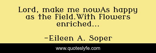 This page presents the quote "Lord, make me nowAs happy as the field.With flowers enriched...". Author of this quote is Eileen A. Soper. This quote is about flowers, contentment, happiness,.