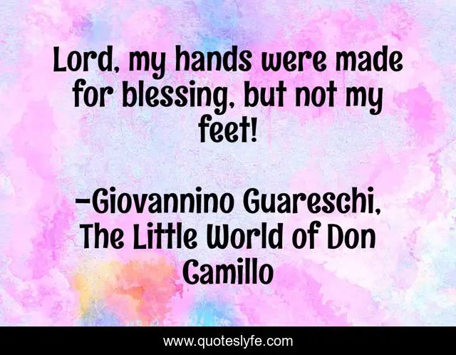 This page presents the quote "Lord, my hands were made for blessing, but not my feet!". Author of this quote is Giovannino Guareschi, The Little World of Don Camillo. This quote is about catholicism, italy, don-camillo, humour, priesthood,.