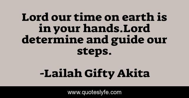 This page presents the quote "Lord our time on earth is in your hands.Lord determine and guide our steps.". Author of this quote is Lailah Gifty Akita. This quote is about destiny-chance, spiritual, prayer-life, destiny, inspired, destiny-and-attitude, prayer, praying, prayerful-habits,.