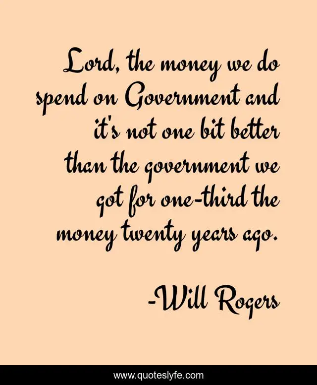 This page presents the quote "Lord, the money we do spend on Government and it's not one bit better than the government we got for one-third the money twenty years ago.". Author of this quote is Will Rogers. This quote is about fiscal-policy, government,.
