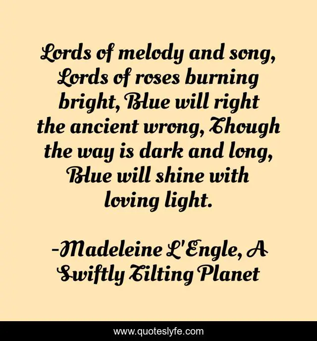 This page presents the quote "Lords of melody and song, Lords of roses burning bright, Blue will right the ancient wrong, Though the way is dark and long, Blue will shine with loving light.". Author of this quote is Madeleine L'Engle, A Swiftly Tilting Planet. This quote is about right, song, light, roses, wrong, melody,.
