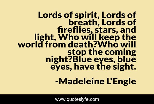 This page presents the quote "Lords of spirit, Lords of breath, Lords of fireflies, stars, and light, Who will keep the world from death?Who will stop the coming night?Blue eyes, blue eyes, have the sight.". Author of this quote is Madeleine L'Engle. This quote is about blue, eyes, death, stars, light, breath, sight, night, world,.