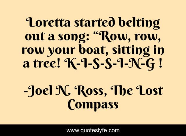 This page presents the quote "Loretta started belting out a song: “Row, row, row your boat, sitting in a tree! K-I-S-S-I-N-G !". Author of this quote is Joel N. Ross, The Lost Compass. This quote is about funny, k-i-s-s-i-n-g, joel-ross, loretta, comedy, lost-compass,.