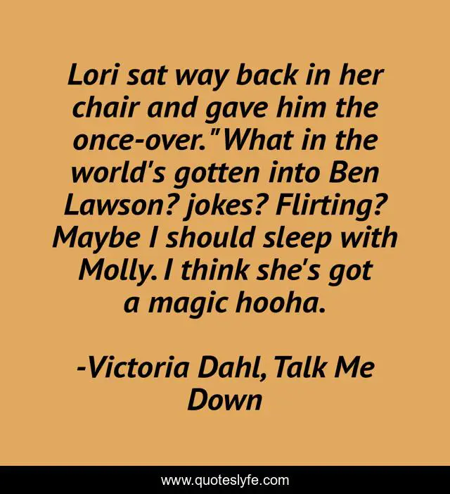 This page presents the quote "Lori sat way back in her chair and gave him the once-over. "What in the world's gotten into Ben Lawson? jokes? Flirting? Maybe I should sleep with Molly. I think she's got a magic hooha.". Author of this quote is Victoria Dahl, Talk Me Down. This quote is about romance, humor,.