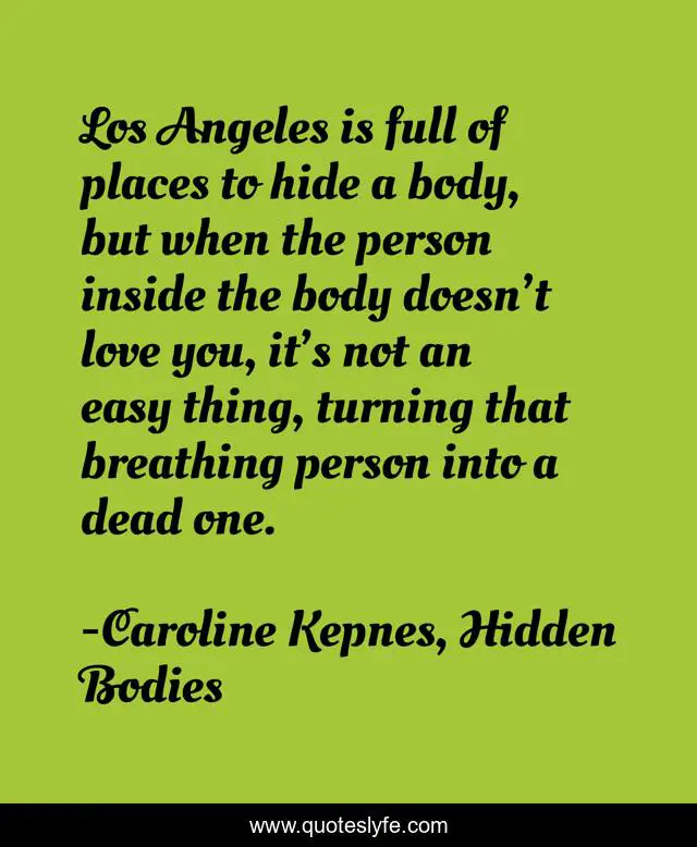 This page presents the quote "Los Angeles is full of places to hide a body, but when the person inside the body doesn’t love you, it’s not an easy thing, turning that breathing person into a dead one.". Author of this quote is Caroline Kepnes, Hidden Bodies. This quote is about caroline-kepnes, joe-goldberg, hidden-bodies, love-hurts,.