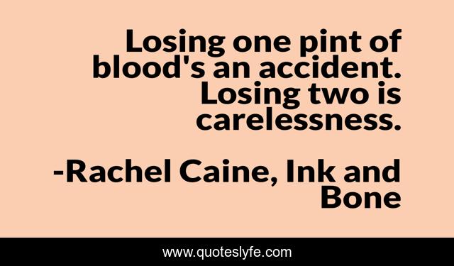 This page presents the quote "Losing one pint of blood's an accident. Losing two is carelessness.". Author of this quote is Rachel Caine, Ink and Bone. This quote is about loss, fight,.