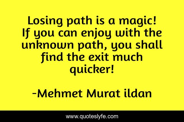 This page presents the quote "Losing path is a magic! If you can enjoy with the unknown path, you shall find the exit much quicker!". Author of this quote is Mehmet Murat ildan. This quote is about magic, murat-ildan, unknown-paths, exit, lose, path, unknown-path,.