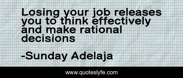 This page presents the quote "Losing your job releases you to think effectively and make rational decisions". Author of this quote is Sunday Adelaja. This quote is about life, blessing, money, finance, freedom, self-evaluation, work, evaluation, job,.