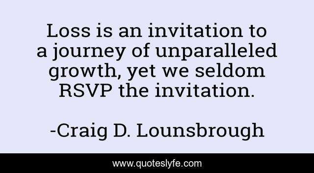 This page presents the quote "Loss is an invitation to a journey of unparalleled growth, yet we seldom RSVP the invitation.". Author of this quote is Craig D. Lounsbrough. This quote is about loss, death, pain, abandoned, losses, grief, growth, invitation, possibilities,.