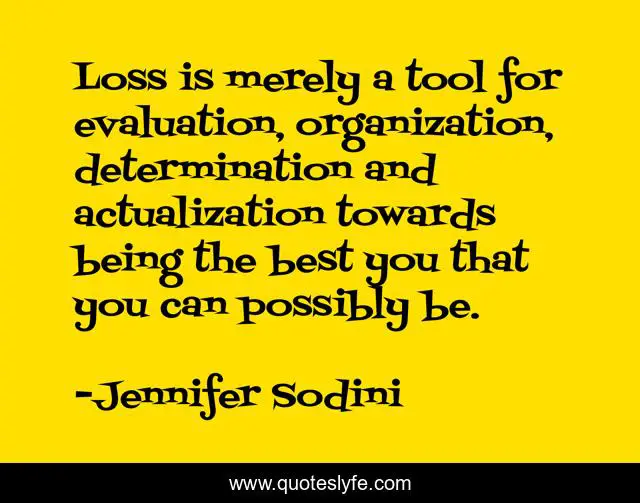 This page presents the quote "Loss is merely a tool for evaluation, organization, determination and actualization towards being the best you that you can possibly be.". Author of this quote is Jennifer Sodini. This quote is about loss, death, quotes-about-losing, quotes-about-love, quotes-about-loss, inspirational, quotes-about-life, enthusiasm, quotes-about-winning,.