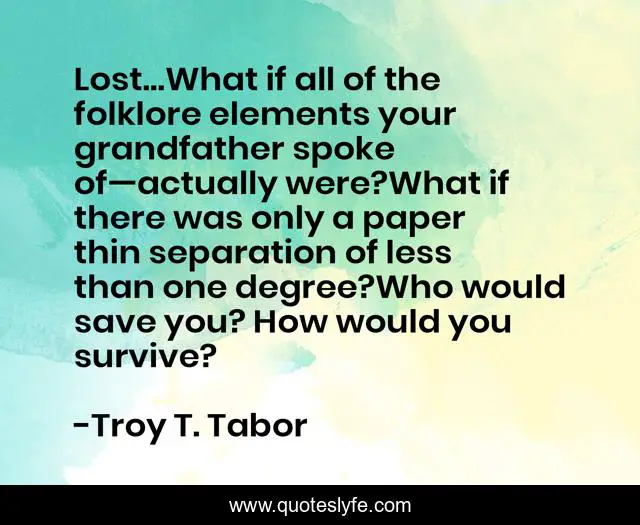 This page presents the quote "Lost…What if all of the folklore elements your grandfather spoke of—actually were?What if there was only a paper thin separation of less than one degree?Who would save you? How would you survive?". Author of this quote is Troy T. Tabor. .