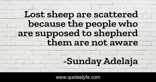 This page presents the quote "Lost sheep are scattered because the people who are supposed to shepherd them are not aware". Author of this quote is Sunday Adelaja. This quote is about sheep, lost, aware,.