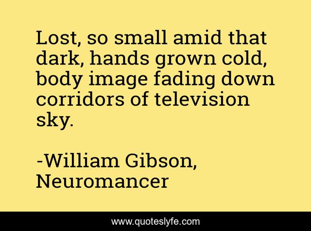This page presents the quote "Lost, so small amid that dark, hands grown cold, body image fading down corridors of television sky.". Author of this quote is William Gibson, Neuromancer. This quote is about dream-state, lost, vulnerability, slipping-away, altered-states, fading,.