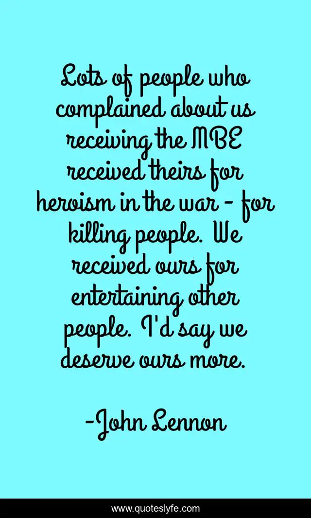 This page presents the quote "Lots of people who complained about us receiving the MBE received theirs for heroism in the war - for killing people. We received ours for entertaining other people. I'd say we deserve ours more.". Author of this quote is John Lennon. This quote is about deserve, heroism, people,.