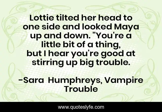 This page presents the quote "Lottie tilted her head to one side and looked Maya up and down. "You're a little bit of a thing, but I hear you're good at stirring up big trouble.". Author of this quote is Sara Humphreys, Vampire Trouble. This quote is about romance, werewolves, gypsies, vampires, paranormal,.