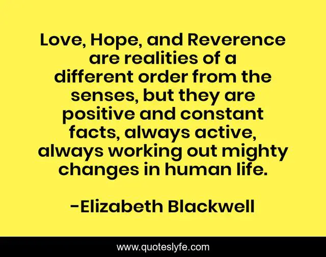 This page presents the quote "Love, Hope, and Reverence are realities of a different order from the senses, but they are positive and constant facts, always active, always working out mighty changes in human life.". Author of this quote is Elizabeth Blackwell. This quote is about love, change, meaning, hope, reverence, affection,.