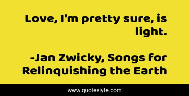 "Jan Zwicky, Songs for Relinquishing the Earth Quotes." Quoteslyfe.com, 2025. Fri. 05 Dec. 2025. <https://www.quoteslyfe.com/quote/Love-I-m-pretty-sure-is-light-118268>.