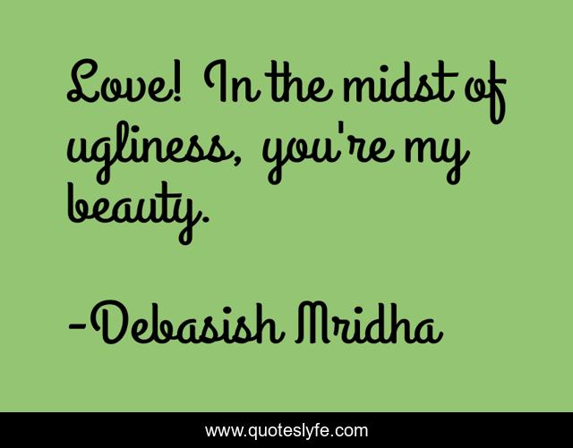 This page presents the quote "Love! In the midst of ugliness, you're my beauty.". Author of this quote is Debasish Mridha. This quote is about life, love, knowledge, inspirational, intelligence, philosophy, wisdom, quotes, affection,.