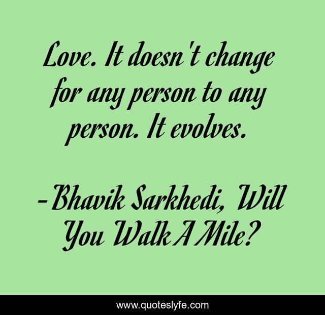 This page presents the quote "Love. It doesn't change for any person to any person. It evolves.". Author of this quote is Bhavik Sarkhedi, Will You Walk A Mile?. This quote is about love, affection,.