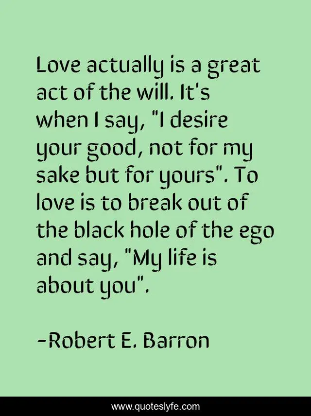 This page presents the quote "Love actually is a great act of the will. It's when I say, "I desire your good, not for my sake but for yours". To love is to break out of the black hole of the ego and say, "My life is about you".". Author of this quote is Robert E. Barron. This quote is about catholic, christian, giving, selflessness, truth, authenticity, self-donation, love, affection,.