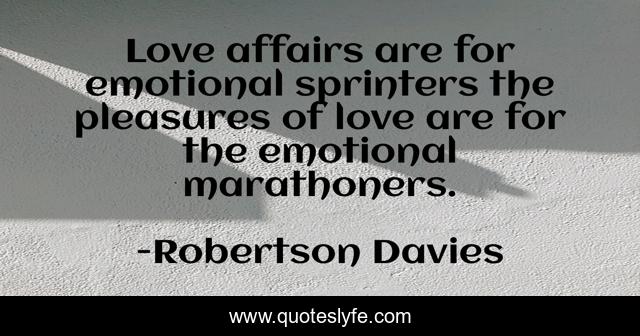 This page presents the quote "Love affairs are for emotional sprinters the pleasures of love are for the emotional marathoners.". Author of this quote is Robertson Davies. This quote is about relationships, dating-advice, love, affection,.