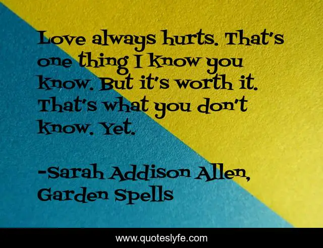 This page presents the quote "Love always hurts. That’s one thing I know you know. But it’s worth it. That’s what you don’t know. Yet.". Author of this quote is Sarah Addison Allen, Garden Spells. This quote is about life-and-living, love, affection,.
