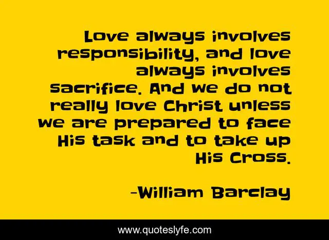This page presents the quote "Love always involves responsibility, and love always involves sacrifice. And we do not really love Christ unless we are prepared to face His task and to take up His Cross.". Author of this quote is William Barclay. This quote is about love, responsibility, affection, face,.
