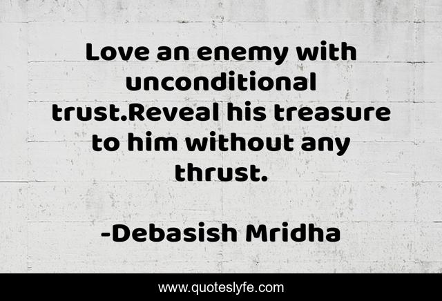 This page presents the quote "Love an enemy with unconditional trust.Reveal his treasure to him without any thrust.". Author of this quote is Debasish Mridha. This quote is about life, love, knowledge, inspirational, intelligence, philosophy, wisdom, quotes, affection,.
