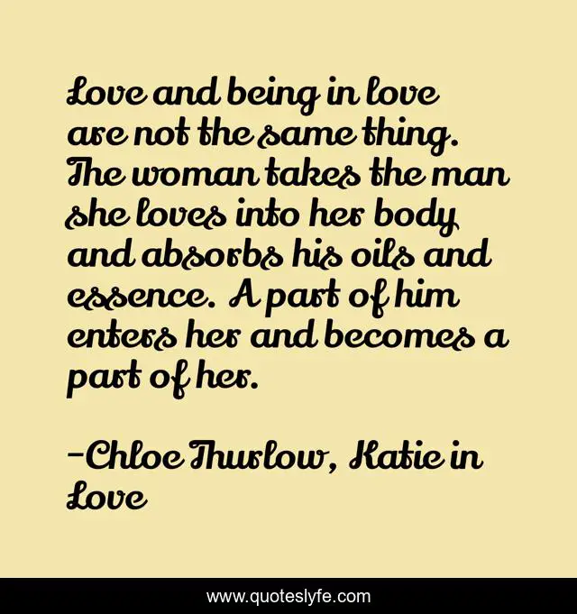 This page presents the quote "Love and being in love are not the same thing. The woman takes the man she loves into her body and absorbs his oils and essence. A part of him enters her and becomes a part of her.". Author of this quote is Chloe Thurlow, Katie in Love. This quote is about love, affection, love-hurts,.