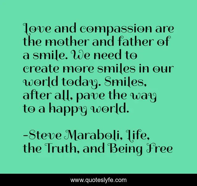 This page presents the quote "Love and compassion are the mother and father of a smile. We need to create more smiles in our world today. Smiles, after all, pave the way to a happy world.". Author of this quote is Steve Maraboli, Life, the Truth, and Being Free. This quote is about smiles, love, compassion, happiness, inspirational, enthusiasm, kindness, affection,.