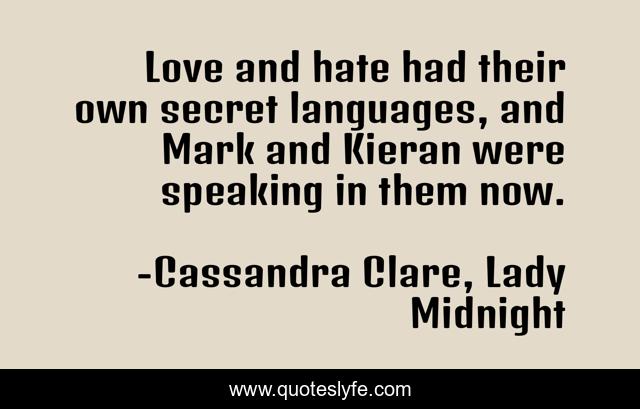 This page presents the quote "Love and hate had their own secret languages, and Mark and Kieran were speaking in them now.". Author of this quote is Cassandra Clare, Lady Midnight. This quote is about kieran, mark-blackthorn, love, faeries, languages, hate, affection,.