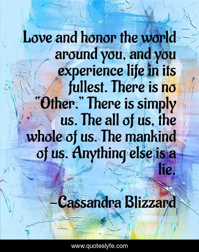 This page presents the quote "Love and honor the world around you, and you experience life in its fullest. There is no “Other.” There is simply us. The all of us, the whole of us. The mankind of us. Anything else is a lie.". Author of this quote is Cassandra Blizzard. This quote is about enthusiasm, peace, a-world-without-color, inspirational,.