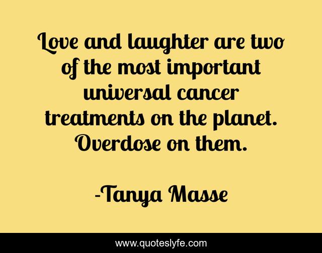 This page presents the quote "Love and laughter are two of the most important universal cancer treatments on the planet. Overdose on them.". Author of this quote is Tanya Masse. This quote is about quotes-about-cancer, cancer,.