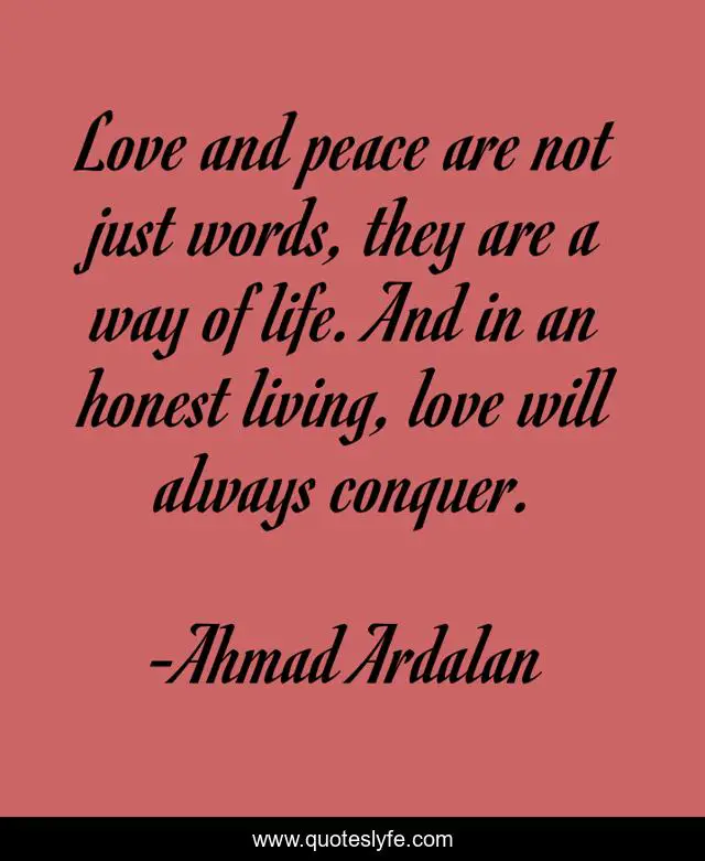This page presents the quote "Love and peace are not just words, they are a way of life. And in an honest living, love will always conquer.". Author of this quote is Ahmad Ardalan. This quote is about faith, life, love, knowledge, sayings, hope, romance, passion, struggle,.
