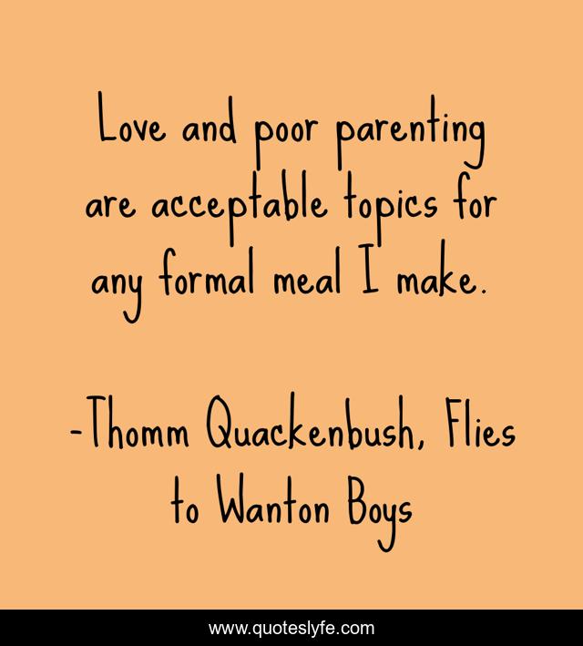 This page presents the quote "Love and poor parenting are acceptable topics for any formal meal I make.". Author of this quote is Thomm Quackenbush, Flies to Wanton Boys. This quote is about parenting, cooking, love, meals, affection,.