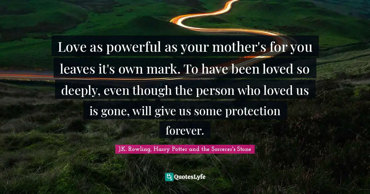 This page presents the quote "Love as powerful as your mother's for you leaves it's own mark. To have been loved so deeply, even though the person who loved us is gone, will give us some protection forever.". Author of this quote is J.K. Rowling, Harry Potter and the Sorcerer's Stone. This quote is about jk-rowling, love, harry-potter, rowling, dumbledore, mother, sorcerer-s-stone, affection,.