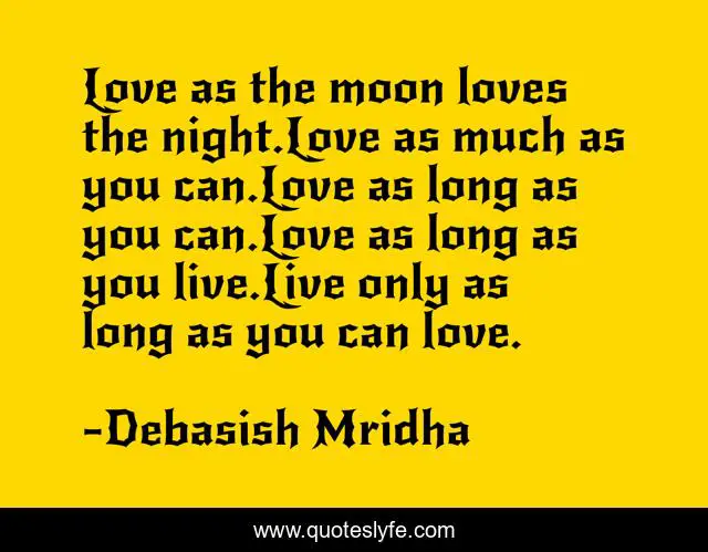 This page presents the quote "Love as the moon loves the night.Love as much as you can.Love as long as you can.Love as long as you live.Live only as long as you can love.". Author of this quote is Debasish Mridha. This quote is about life, love, knowledge, inspirational, intelligence, philosophy, wisdom, quotes, affection,.