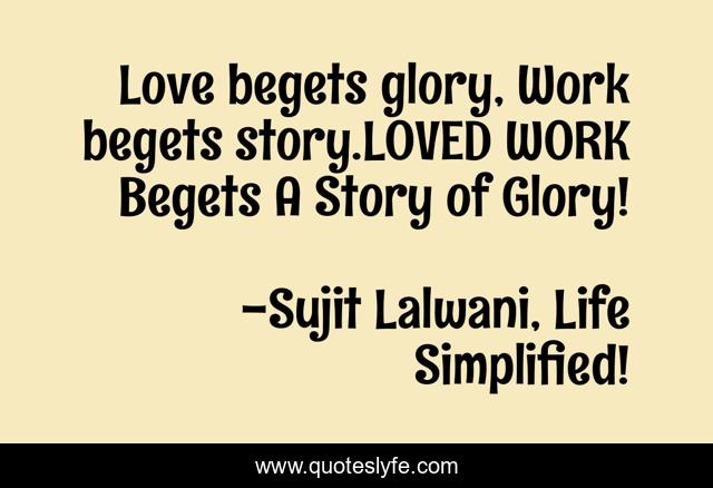 This page presents the quote "Love begets glory, Work begets story.LOVED WORK Begets A Story of Glory!". Author of this quote is Sujit Lalwani, Life Simplified!. This quote is about life, love, work, courage, determination, affection, inspiration,.
