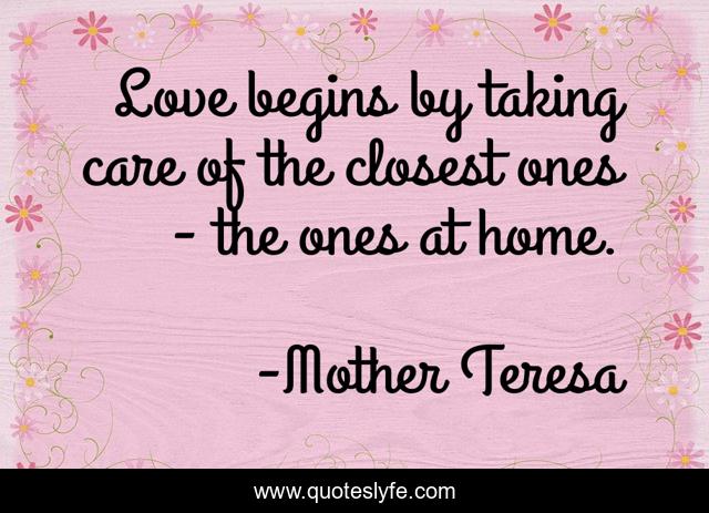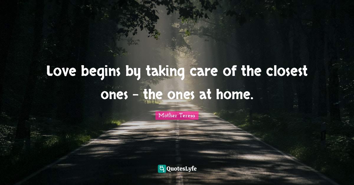 This page presents the quote "Love begins by taking care of the closest ones - the ones at home.". Author of this quote is Mother Teresa. This quote is about home, taking, care,.