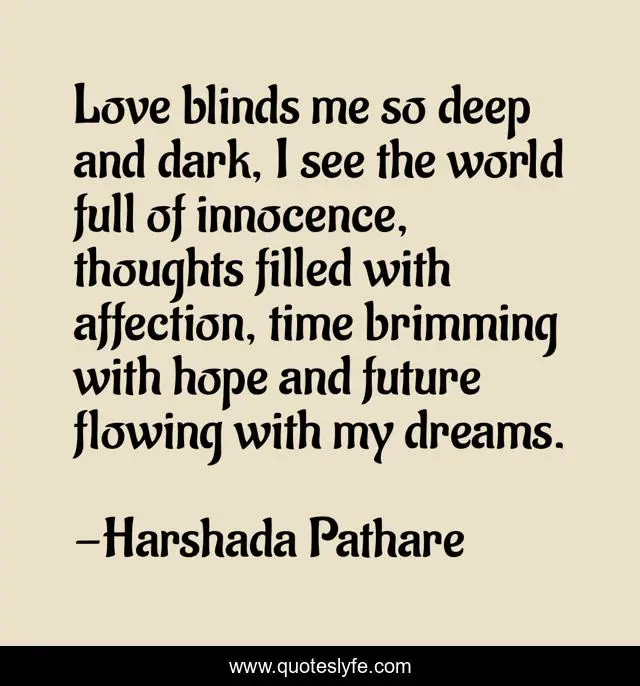 This page presents the quote "Love blinds me so deep and dark, I see the world full of innocence, thoughts filled with affection, time brimming with hope and future flowing with my dreams.". Author of this quote is Harshada Pathare. This quote is about love, passion, emotions, affection,.