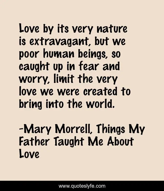 This page presents the quote "Love by its very nature is extravagant, but we poor human beings, so caught up in fear and worry, limit the very love we were created to bring into the world.". Author of this quote is Mary Morrell, Things My Father Taught Me About Love. This quote is about love, limit, worry, world, extravagant, fear, human-being, affection,.